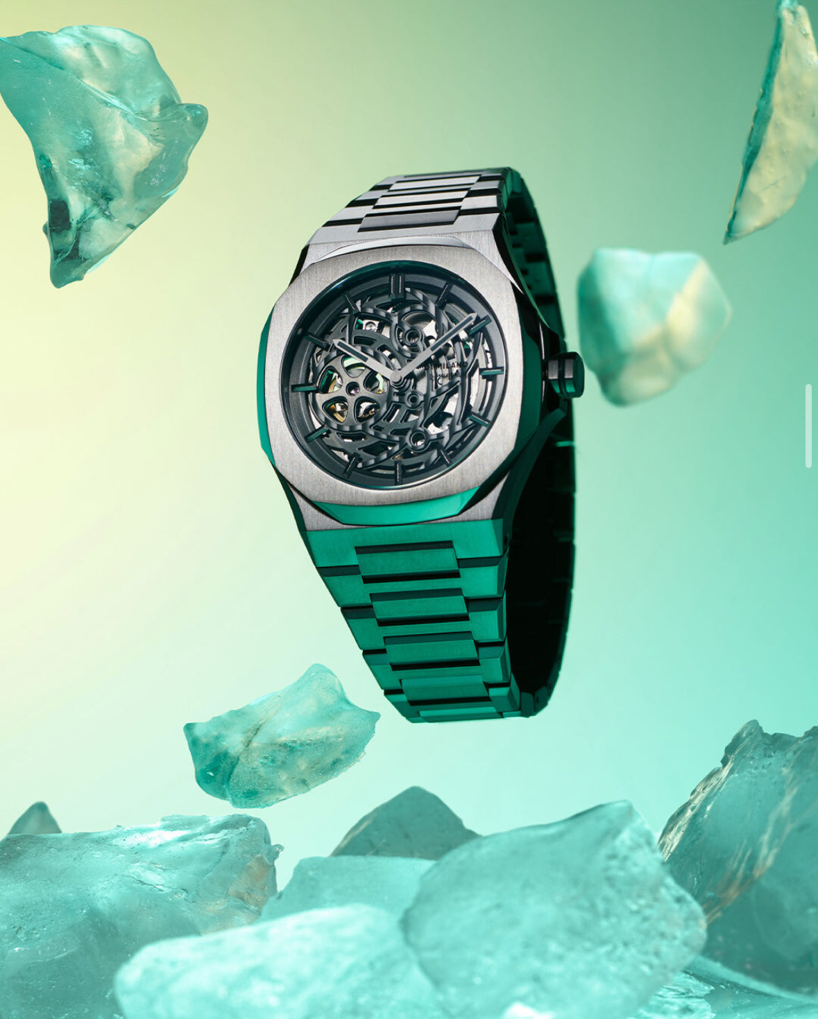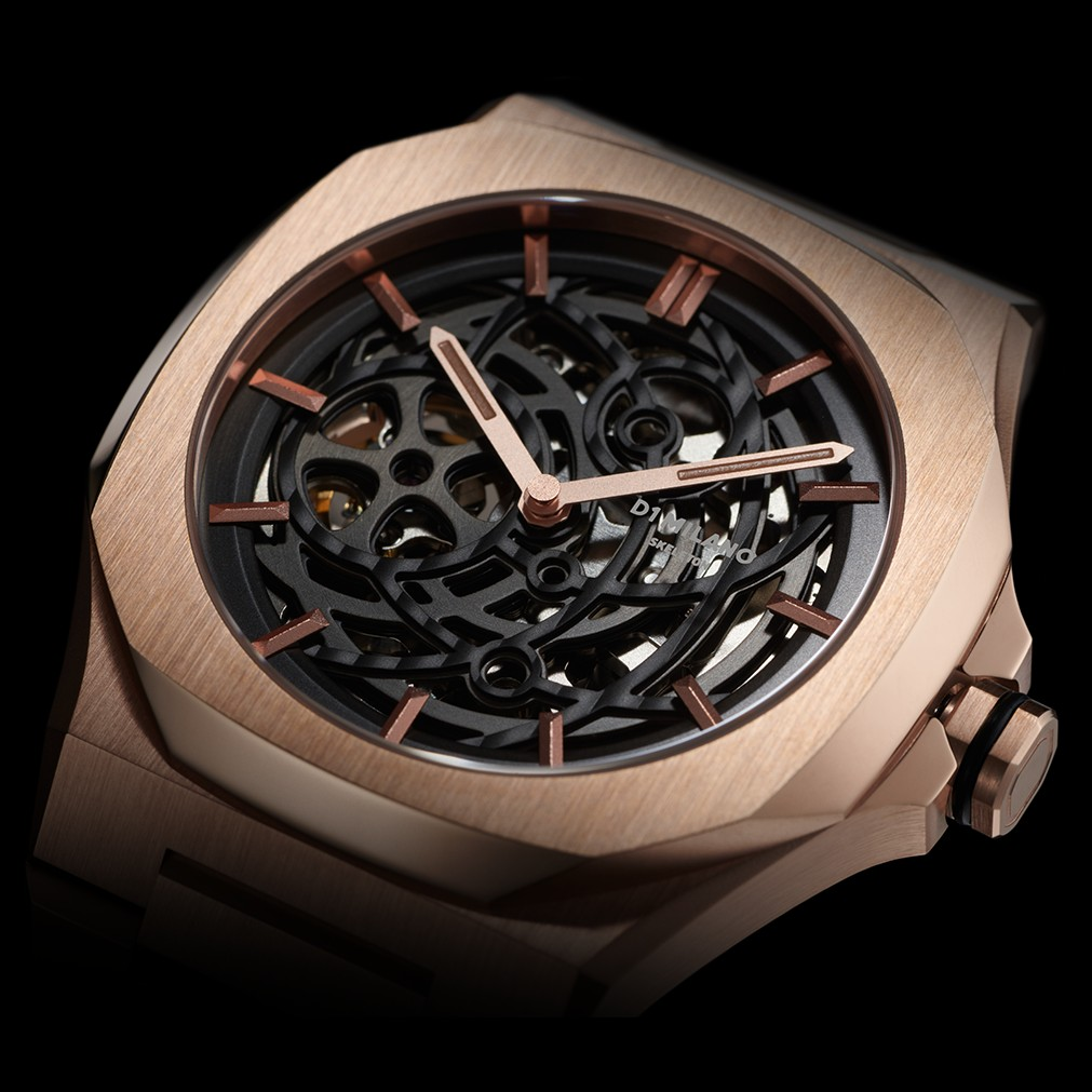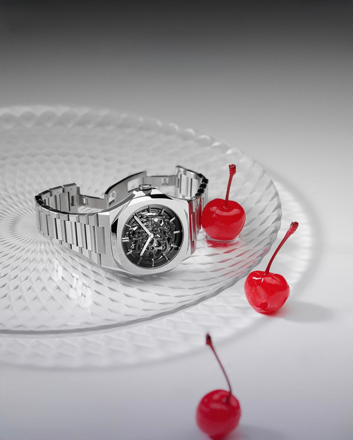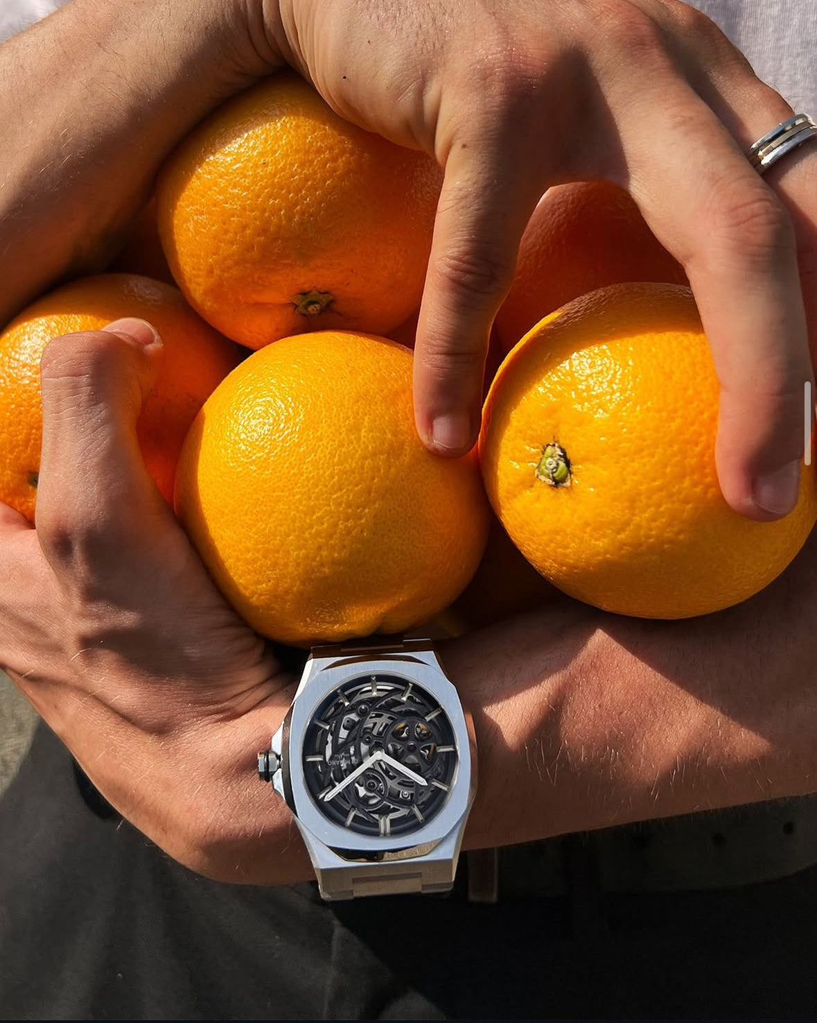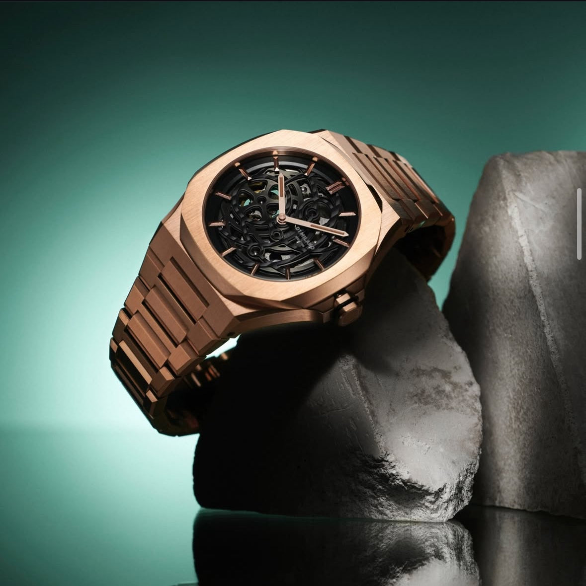 文字盤からムーブメントが覗くスケルトン仕様で、時計の内部構造を眺める楽しさがあります。見た目にもインパクトがあり、メカ好きにはたまらない一本です。