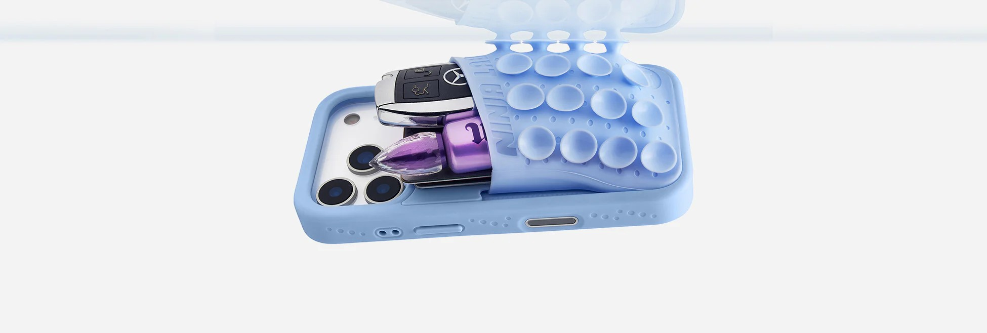 これは、伸縮性のあるFlex Pouchが一体になったスマホケースです。