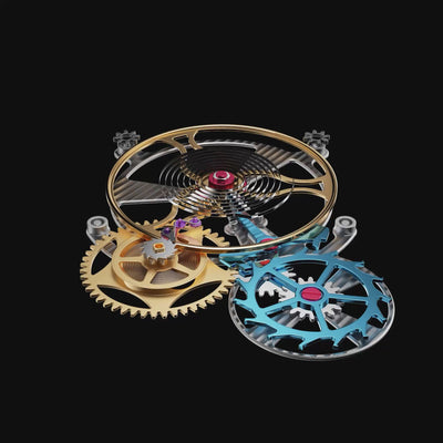 素材:脱進車・ガンギ車(ステンレススチール)、バランスホイールのブッシング(真鍮)、香箱ゼンマイ(炭素鋼)、クリスタル(サファイア)