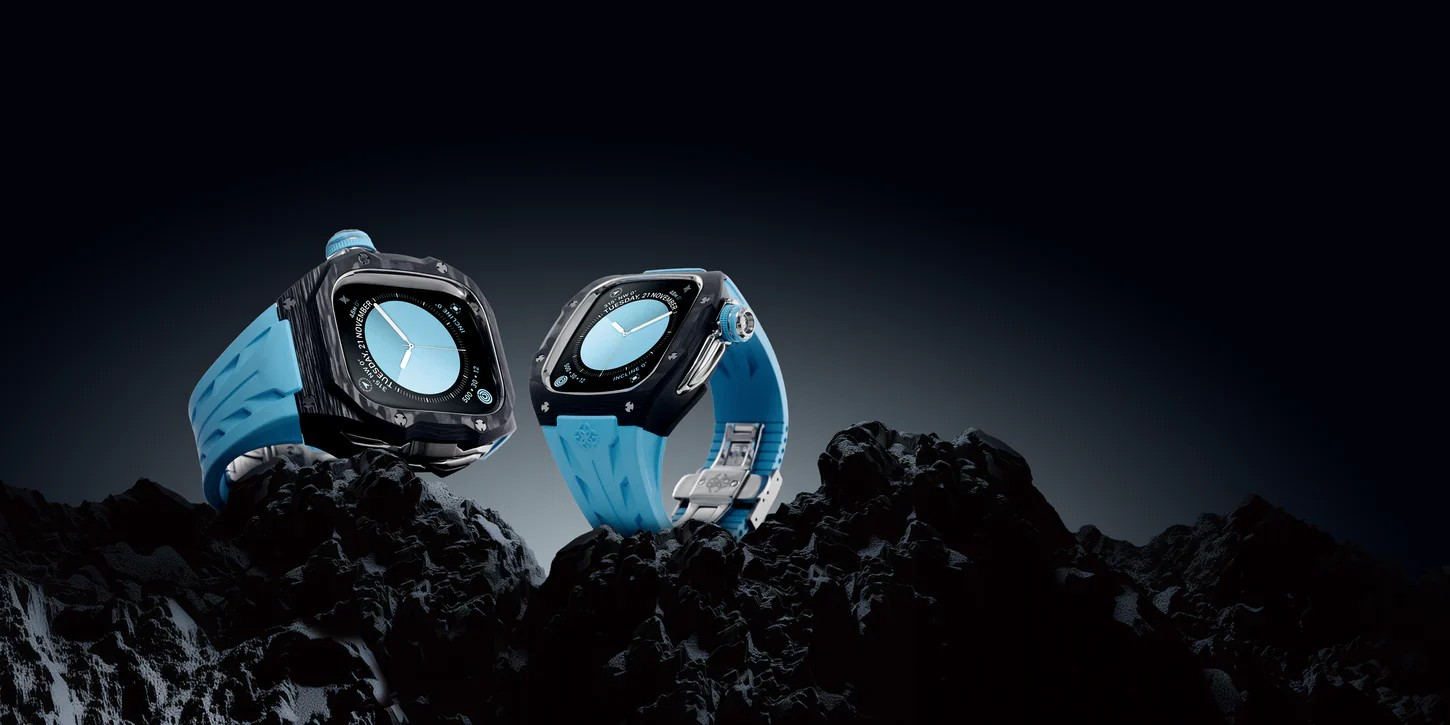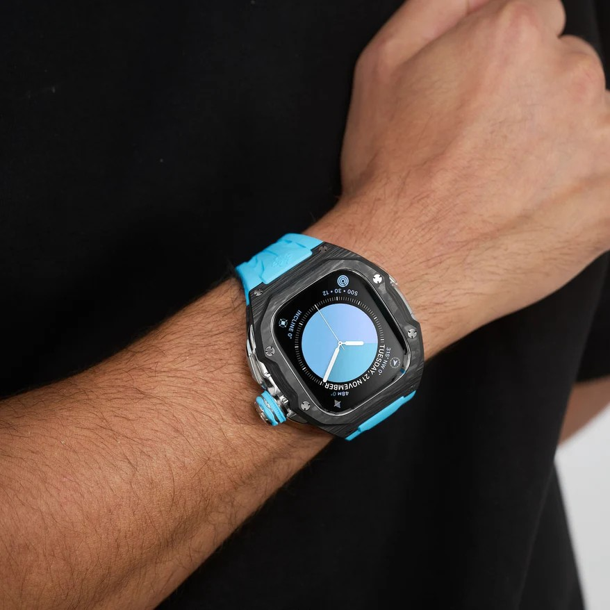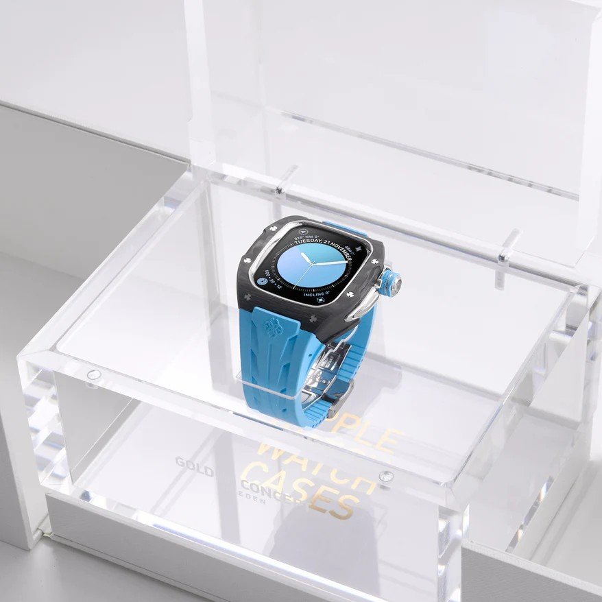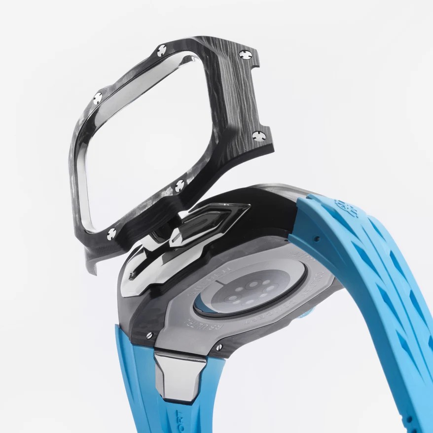 マットなカーボンケースには、圧縮カーボンを削り出して生まれる唯一無二の模様が浮かび上がり、磨き上げられたシルバーのアクセントが美しく調和します。鮮やかなブルーストラップがラグジュアリーな存在感を引き立て、洗練とタフネスを併せ持つ一本に仕上がりました。