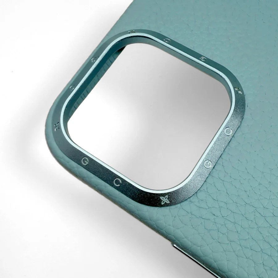 デザインの中核を成すのは、カメラ部分を縁取るアルミニウム製のフレーム。表面にはGCモノグラムの刻印が施され、カラーはアルマイト処理によって金属と一体化。これにより、優れた耐久性と耐傷性、そして色あせしにくい美しい仕上がりを実現しています。マットな質感でありながら光を柔らかく反射し、レザーの豊かな表情とのコントラストが、エレガントな存在感を引き立てます。