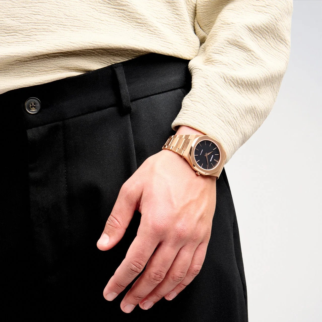 About UTBJ42 - Re_Rosegold <br>A classic watch with a modern sensibility and careful attention to detail. The matte black dial beautifully complements the rose gold-finished stainless steel case and bracelet, creating an elegant and sophisticated contrast. The simple design is alive with the beauty of the texture of the material and the finish. It naturally blends in with a wide range of scenes from business to formal, and adds a subtle elegance to adult styles.