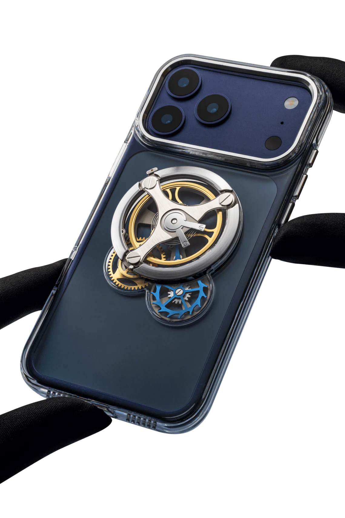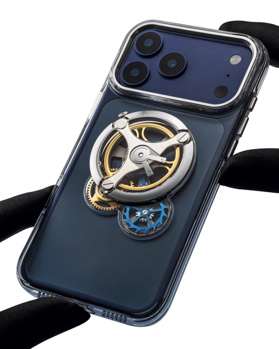 機械式時計のエスケープメント(脱進機)をモチーフにデザインされたスマートフォンケース。ケース内部の精巧なメカニズムは実際に動作し、視覚と触感の両方で時間の流れを感じられます。スマートフォンを保護するだけでなく、精密な時計づくりの技術を日常のアイテムに落とし込んだ特別なアイテムです。
