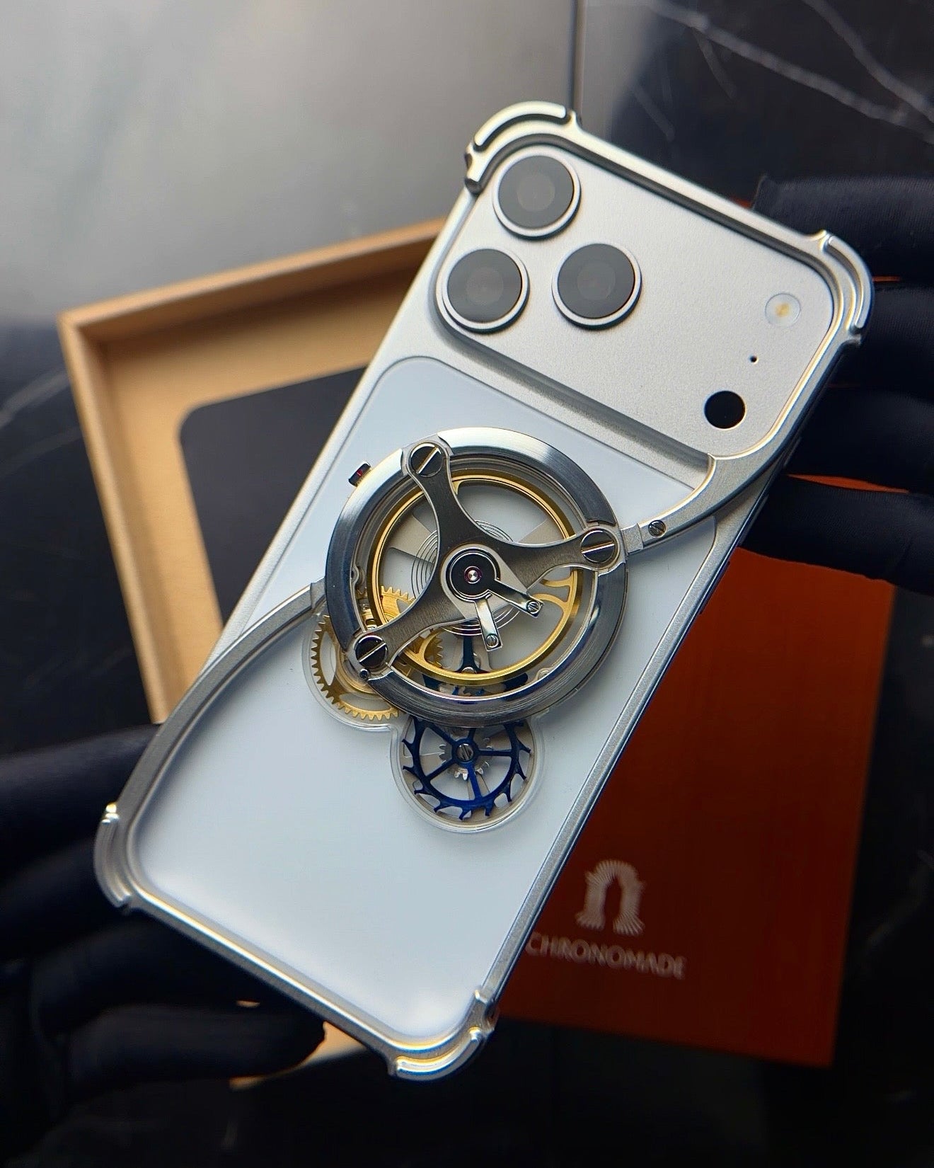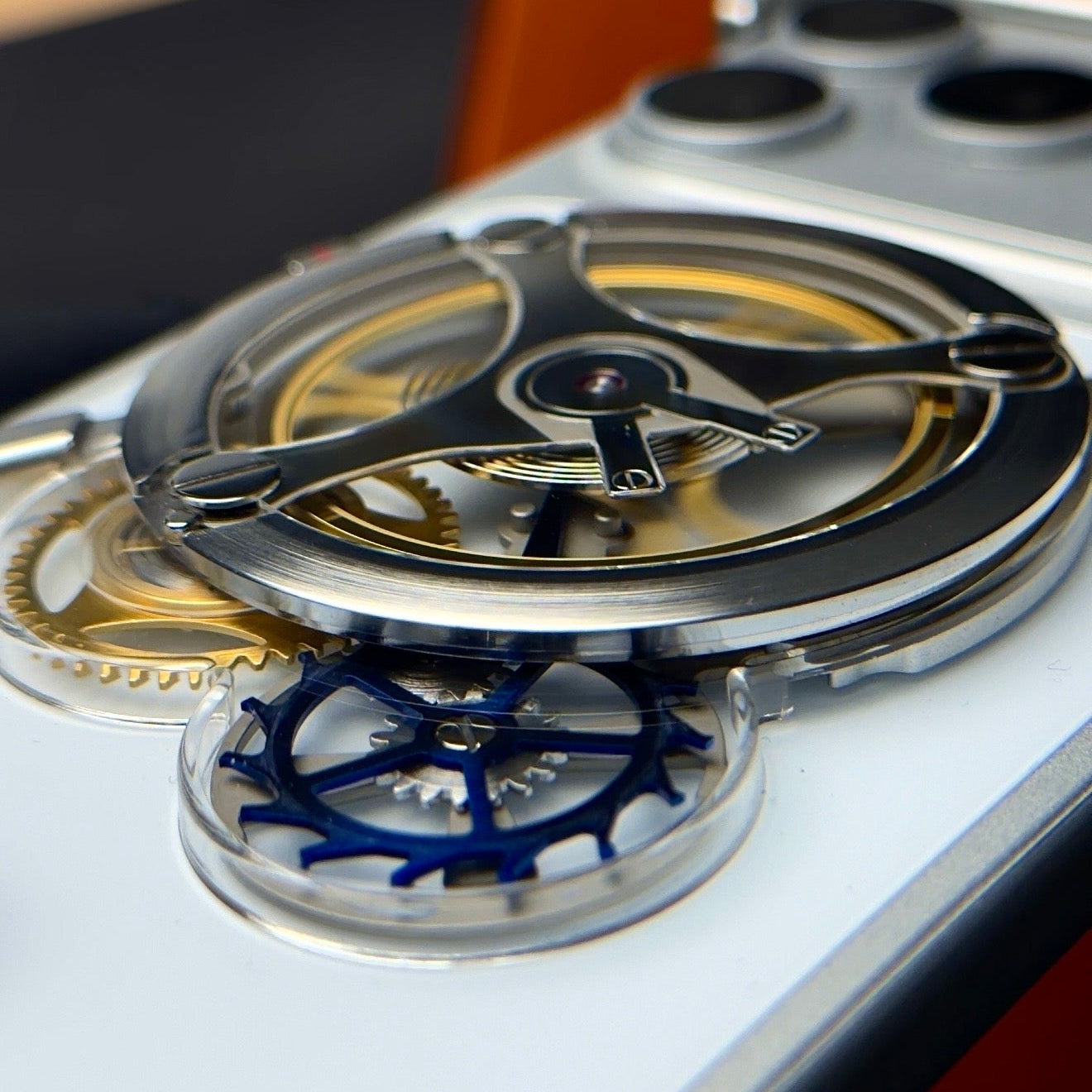 本モデルは、機械式時計のエスケープメント(脱進機)をモチーフにデザインされたスマートフォンケースです。ケース内部の精巧なメカニズムは実際に動作し、視覚と触感の両方で時間の流れを感じられます。スマートフォンを保護するだけでなく、精密な時計づくりの技術を日常のアイテムに落とし込んだ特別なアイテムです。
